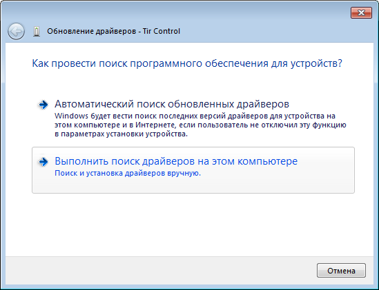 В диспетчере устройств найдите устройство Tir Control, щелкните по нему правой кнопкой мыши и выберите пункт Обновить драйверы.