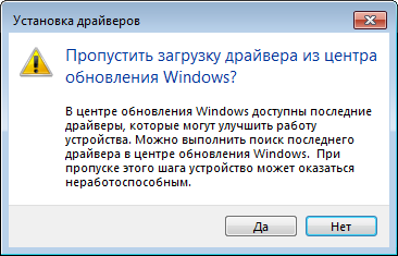 Щелкните на это сообщение, чтобы открыть окно Установка драйверов. В окне Установка драйверов нажмите на ссылку Пропустить загрузку драйверов из центра обновления Windows.